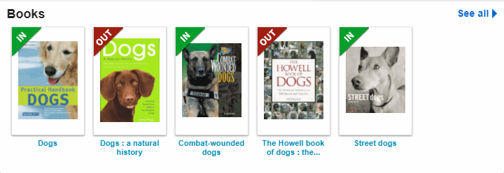 SearchThe search feature defaults to the Keyword setting. Type your search topics into the Search bar, and then click the magnifying glass icon to begin your search. For more information on searches, see Search. Browse by TopicDestiny Discover's "Browse by Topic" feature lets you do a subject search based on the selected topic/genre. You can click one of 13 icons, located on a ribbon on the Destiny Discover homepage, to begin your search. note The "Browse by Topic" feature does not show search results on the Open Educational Resources tab. The "Browse by Topic" ribbon for Middle/High is as follows: Search resultsThe search results appear in ribbons and tabs. Ribbons display your search results with a See all 4 link. Click/Tap for a ribbon example