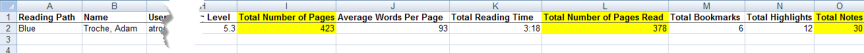 reading, number of pages read, and any highlighted text or notes taken for each eBook in